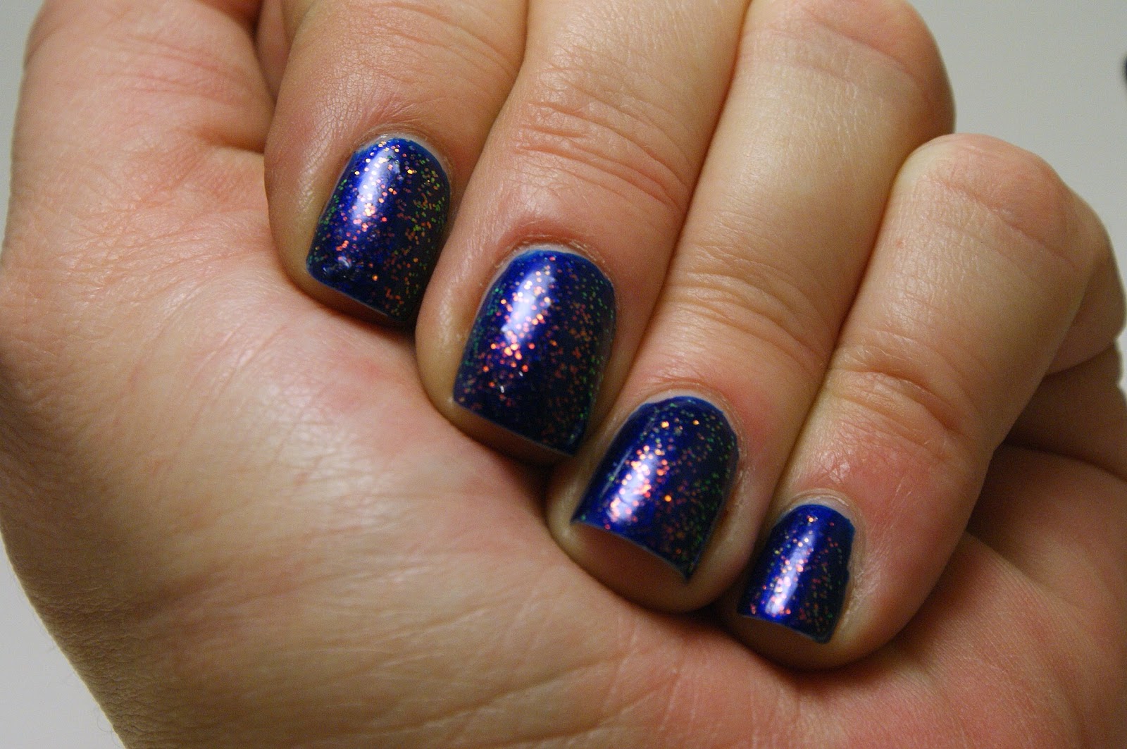 J'avais promis de le poser sur une base bleue pour qu'il tienne les promesses liées à son nom. Mais de qui s'agit-il ? Et bien de mon Chunky Holo Bluebell ! Et là j'ai halluciné, il est tout aussi beau que sur une base noire. Je vous laisse juge :