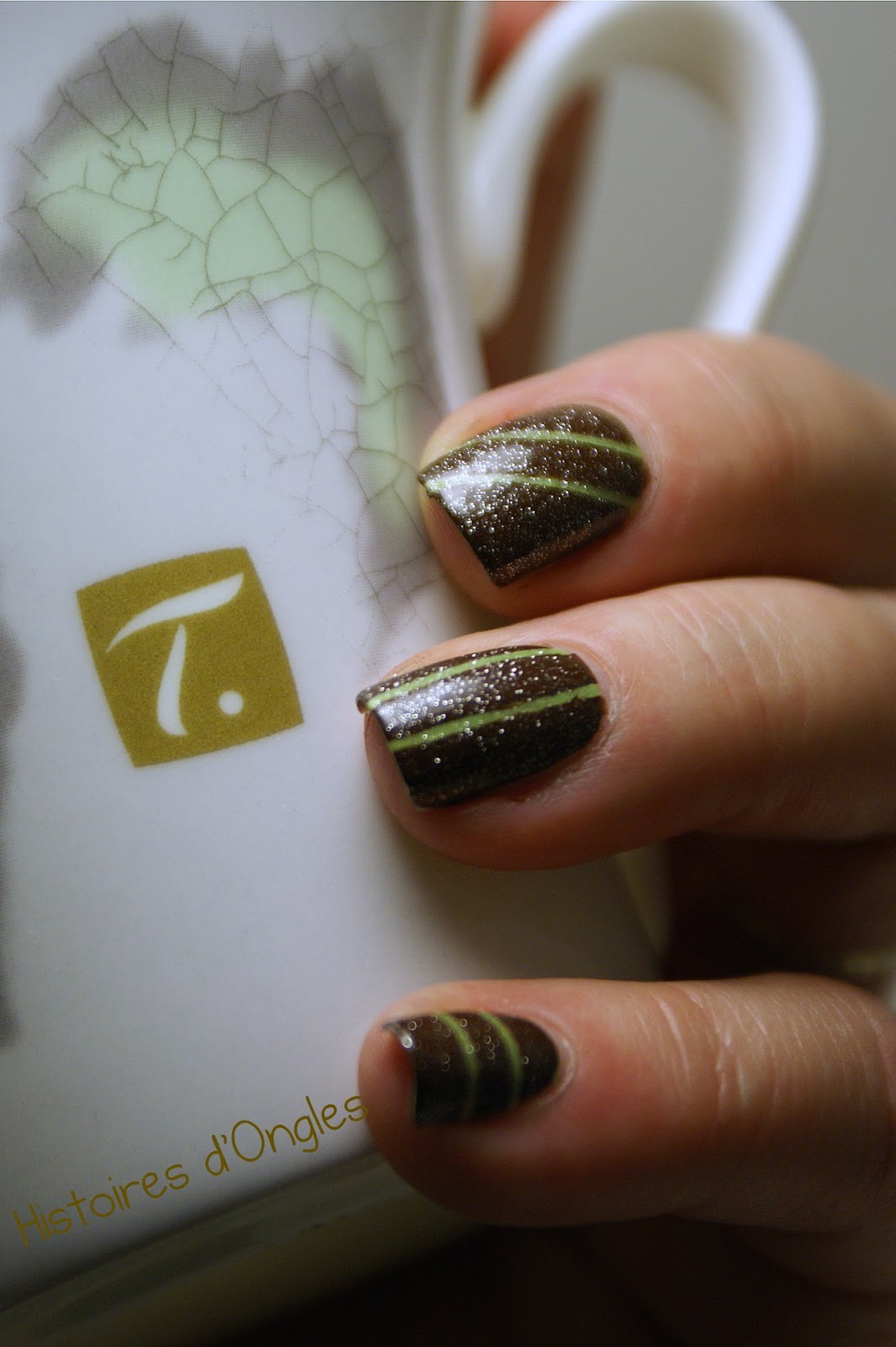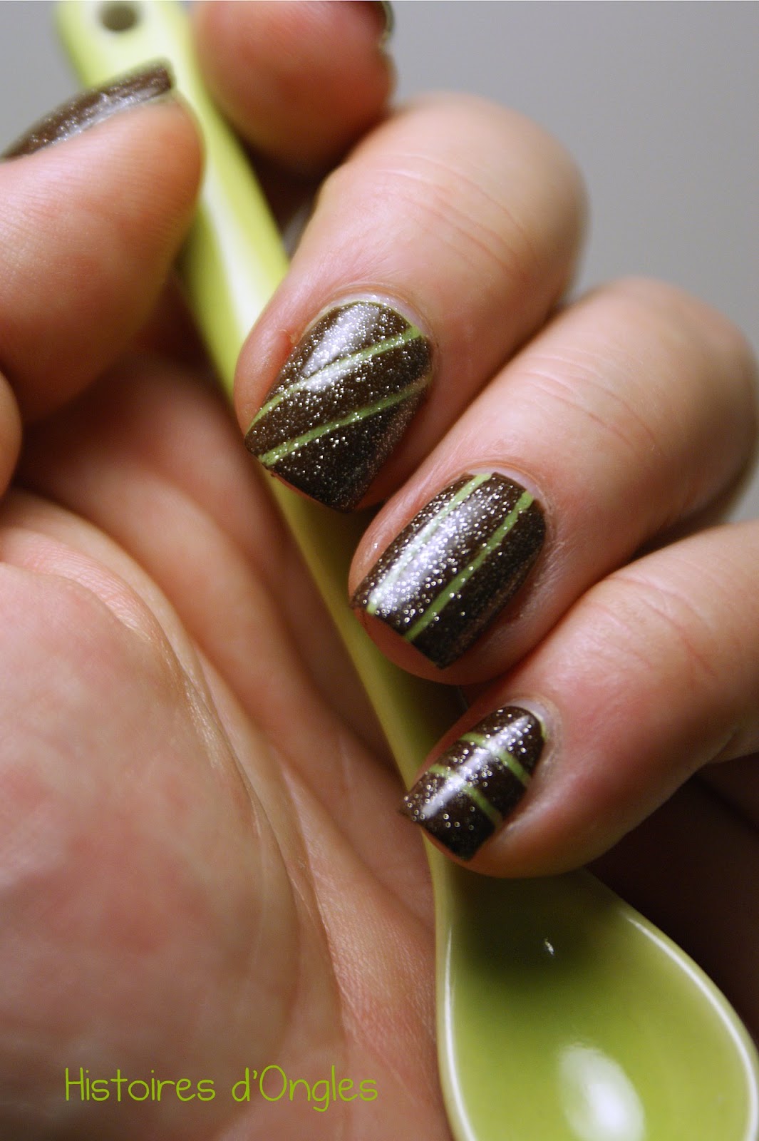 Association du chocolat et de la pistache pour la gourmande que je suis, quoi de plus normal ?! Nail art réalisé avec mes derniers achats soldés, hummm quel régal :